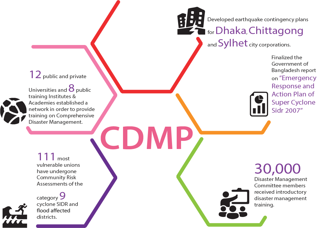 দুর্যোগ ব্যবস্থাপনা অধিদপ্তেরর সৃষ্টি : ২০১২ সালের নভেম্বর মাসে ’দুর্যোগ ব্যবস্থাপনা আইন -২০১২’ অনুমোদন লাভের পর দুর্যোগ ব্যবস্থাপনা ও ত্রাণ মন্ত্রনালয়ের অধীনে ’দুর্যোগ ব্যবস্থাপনা অধিদপ্তর (ডি ডি এম)’ প্রতিষ্ঠিত হয় । দুর্যোগ ব্যবস্থাপনা আইনের উদ্দেশ্য বাস্থবায়ন এই অধিদপ্তরের মান্ডেট - ঝুঁকি হ্রাস কর্মসূচি গ্রহনের মাধ্যমে বিভিন্ন দুর্যোগের বিপদাপন্নতা হ্রাস করা বিশেষভাবে দরিদ্র ও সুবিধাবঞ্চিত মানুষের সামর্থ্য বৃদ্ধির জন্য কার্যকর মানবিক সহায়তা কর্মসূচি গ্রহণ করা , দুর্যোগ ঝুঁকি হ্রাস এবং জরুরী সাড়াদানের সাথে সংশিস্নষ্ট বিভিন্ন সরকারী ও সরকারী সংস্থাসমূহ কর্তৃক গৃহিত বিভিন্ন কর্মসূচিরর মধ্যে সমন্বয় সাধন । দুর্যোগ ব্যবস্থাপনা এবং জাতীয় দুর্যোগ ব্যবস্থাপনা নীতিমালা ও পরিকল্পনা সম্পর্কিত সরকারের নির্দেশাবলী এবং সুপারিশসমূহ বাস্তবায়ন দুর্যোগ ব্যবস্থাপনা অধিদপ্তরের (ডি ডি এম) অন্যতম দায়িত্ব।